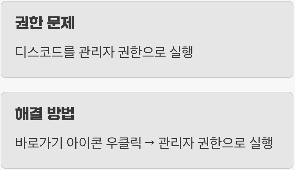 이 문제를 해결하는 가장 간단한 방법은 디스코드를 '관리자 권한으로 실행'하는 것입니다. 바탕화면의 디스코드 바로가기 아이콘에 마우스 오른쪽 버튼을 클릭하여 '관리자 권한으로 실행'을 선택해 보세요. 이 방법만으로도 해결되지 않던 오버레이 문제가 마법처럼 해결되는 경우가 매우 많습니다.