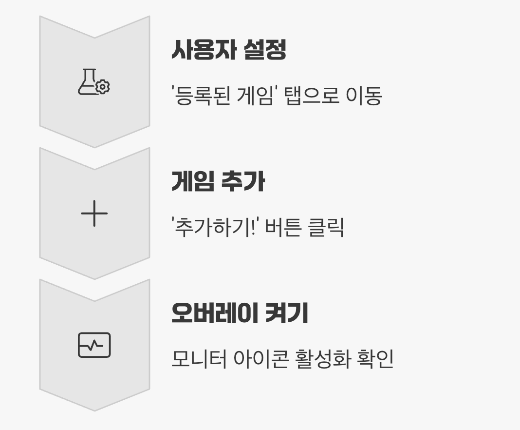 '사용자 설정'에서 '등록된 게임' 탭으로 이동하세요. 만약 현재 실행 중인 게임이 목록에 보이지 않는다면, '추가하기!' 버튼을 눌러 직접 게임을 추가해 주세요. 게임을 추가한 뒤에는, 해당 게임 이름 옆의 모니터 모양 아이콘이 활성화되어 있는지 반드시 확인해야 합니다. 이 아이콘을 클릭하여 '오버레이 켬' 상태로 만들어주는 것이, 특정 게임에서 오버레이를 보기 위한 가장 확실한 해결책입니다.