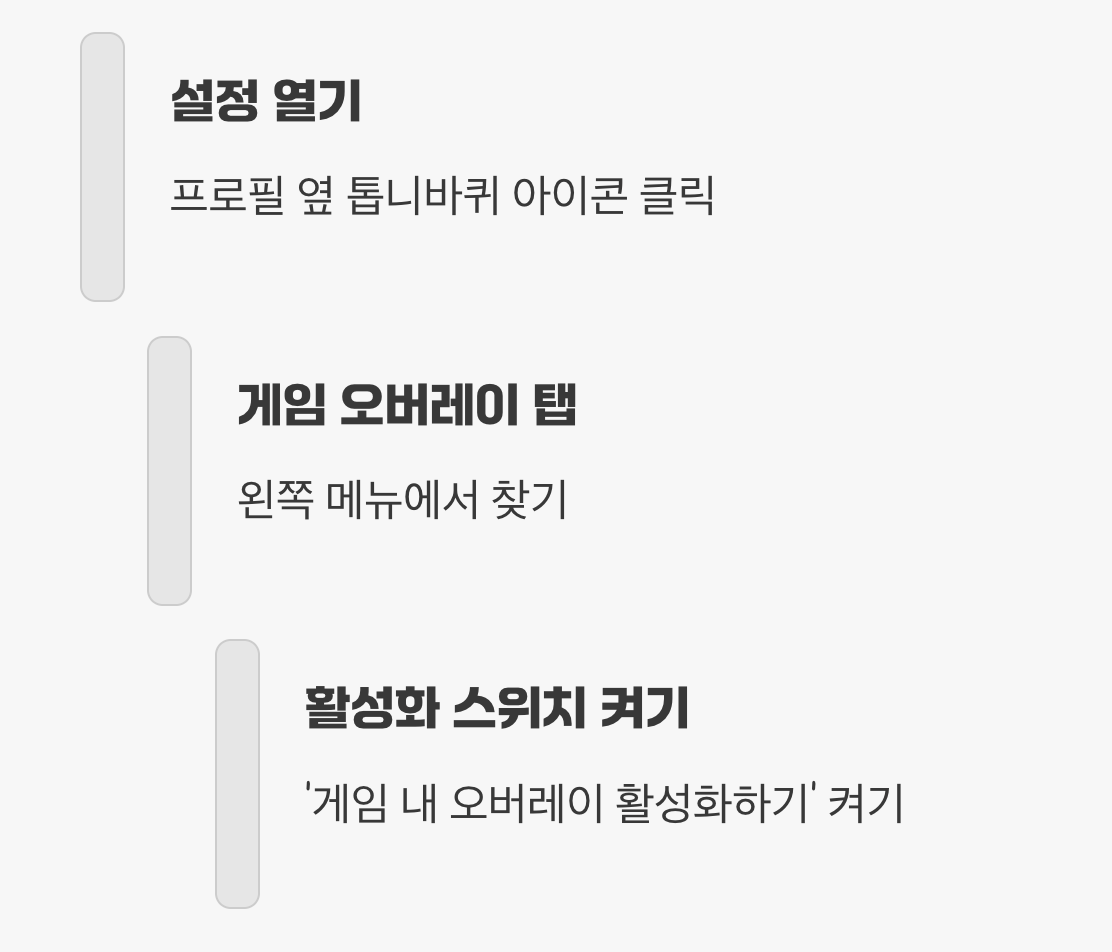 가장 위에 있는 '게임 내 오버레이 활성화하기' 스위치가 꺼져 있다면, 클릭하여 켜주세요. 이것이 오버레이를 사용하기 위한 가장 기본적인 첫 번째 단계입니다. 이 스위치 하나를 켜는 것만으로도 여러분의 게임 경험은 한결 쾌적해질 준비를 마친 것입니다.