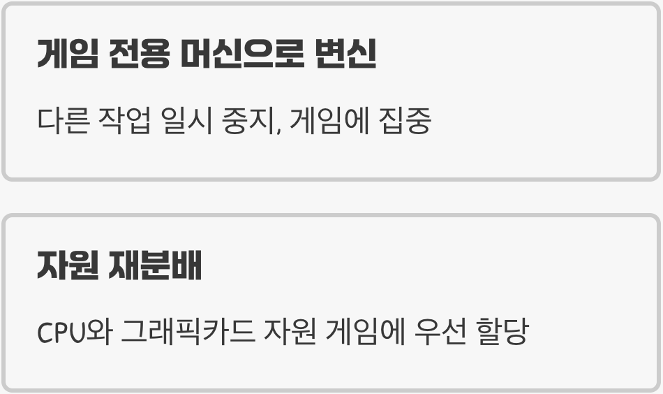 구체적으로는 백그라운드에서 실행 중인 다른 프로그램이나 윈도우 업데이트 같은 작업들의 활동을 최소화하고, CPU와 그래픽카드의 자원을 실행 중인 게임에 최우선으로 할당해 줍니다. 이를 통해 프레임 드랍 현상을 줄이고, 전반적으로 더 부드럽고 안정적인 게임 환경을 만들어주는 것이 이 기능의 핵심 목표이자 해결책입니다.
