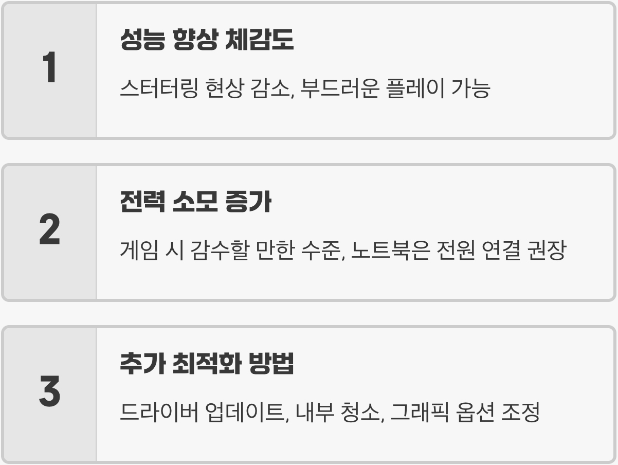 A. 네, 그렇습니다. 특히 PC 사양이 높지 않거나, 여러 프로그램을 동시에 사용하는 환경일수록 그 효과는 더욱 크게 체감됩니다. 프레임이 수십 단위로 오르는 극적인 변화는 아닐지라도, 게임 중 갑자기 화면이 뚝 끊기는 '스터터링(Stuttering)' 현상을 크게 줄여주어 훨씬 쾌적하고 부드러운 플레이가 가능해집니다.