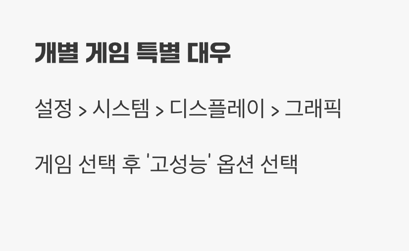 '설정 > 시스템 > 디스플레이'로 이동한 뒤, 맨 아래에 있는 '그래픽' 메뉴를 클릭하세요. 여기서 성능을 최적화하고 싶은 게임을 찾아 목록에 추가한 뒤, '옵션' 버튼을 누릅니다. '그래픽 기본 설정' 창이 나타나면 '고성능'을 선택하고 저장하세요. 이는 PC가 내장 그래픽과 외장 그래픽을 모두 사용하는 노트북 환경에서 특히 더 극적인 성능 향상을 가져오는 해결책입니다.