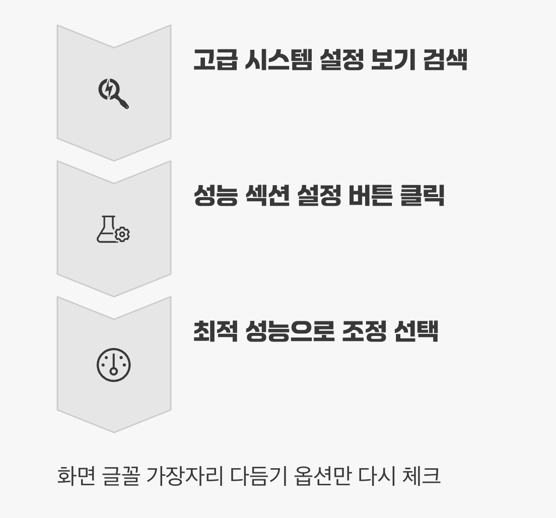 작업 표시줄 검색창에 '고급 시스템 설정 보기'를 입력하여 실행한 뒤, '성능' 섹션의 '설정' 버튼을 누르세요. '시각 효과' 탭에서 '최적 성능으로 조정'을 선택하면 모든 효과가 꺼져 가장 빠른 환경이 됩니다. 하지만 글꼴이 깨져 보일 수 있으니, '최적 성능으로 조정'을 선택한 후 바로 아래 목록에서 '화면 글꼴의 가장자리 다듬기' 항목만 다시 체크해 주는 것이 사용 편의와 성능을 모두 잡는 팁입니다.