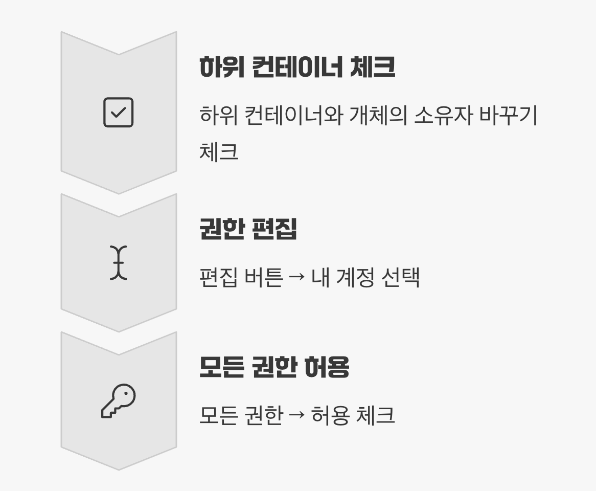 소유자를 나로 바꿨다고 해서 모든 과정이 끝난 것은 아닙니다. 이제 새로운 주인이 된 나에게 이 문을 열 수 있는 ‘모든 열쇠(모든 권한)’를 주어야 합니다. ‘고급 보안 설정’ 창으로 돌아와서, 방금 변경한 소유자 이름 아래에 있는 ‘하위 컨테이너와 개체의 소유자 바꾸기’ 항목에 반드시 체크해 주세요. 이 항목에 체크해야, 폴더 안의 모든 하위 폴더와 파일들의 주인까지 한 번에 바꿀 수 있습니다.