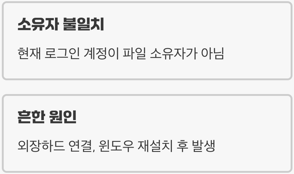 이런 접근 불가 문제가 발생하는 가장 흔한 원인은, 해당 파일이나 폴더의 ‘소유자’가 현재 내가 로그인한 계정으로 되어있지 않기 때문입니다. 특히 다른 PC에서 사용하던 외장 하드를 연결했거나, 윈도우를 새로 설치한 뒤 이전의 자료를 옮겨왔을 때 이런 현상이 자주 발생합니다.
