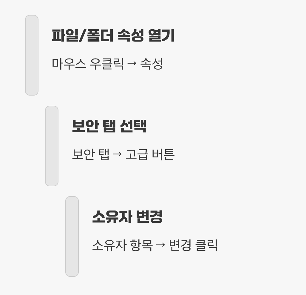 윈도우는 보안을 위해, 각 파일과 폴더마다 주인을 지정하고 그 주인에게만 모든 권한을 부여합니다. 이전 PC의 ‘A’라는 주인이 만든 파일을, 새로운 PC의 ‘B’라는 내가 열려고 하니 "당신은 주인이 아니므로 들어올 수 없습니다"라고 막아서는 것이죠. 따라서 이 문제를 해결하기 위한 첫걸음은, 이 파일의 주인을 바로 ‘나’로 바꾸는 것입니다.