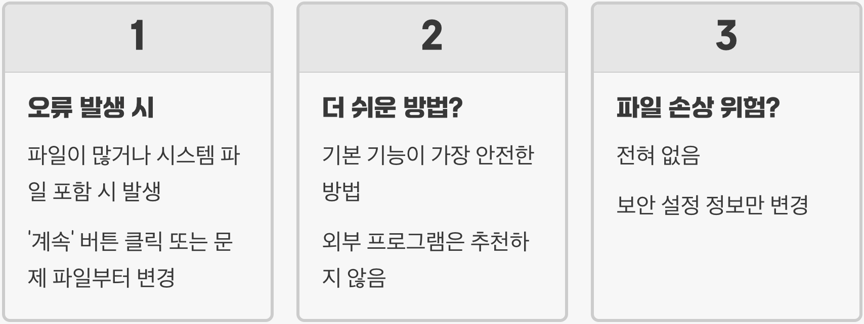 A. 오늘 알려드린 방법이 윈도우의 기본 기능만을 이용하는 가장 정석적이고 안전한 방법입니다. 물론 소유권과 권한을 자동으로 변경해 주는 외부 프로그램을 사용할 수도 있지만, 검증되지 않은 프로그램은 오히려 다른 시스템 문제를 일으킬 수 있으므로 추천하지 않습니다.