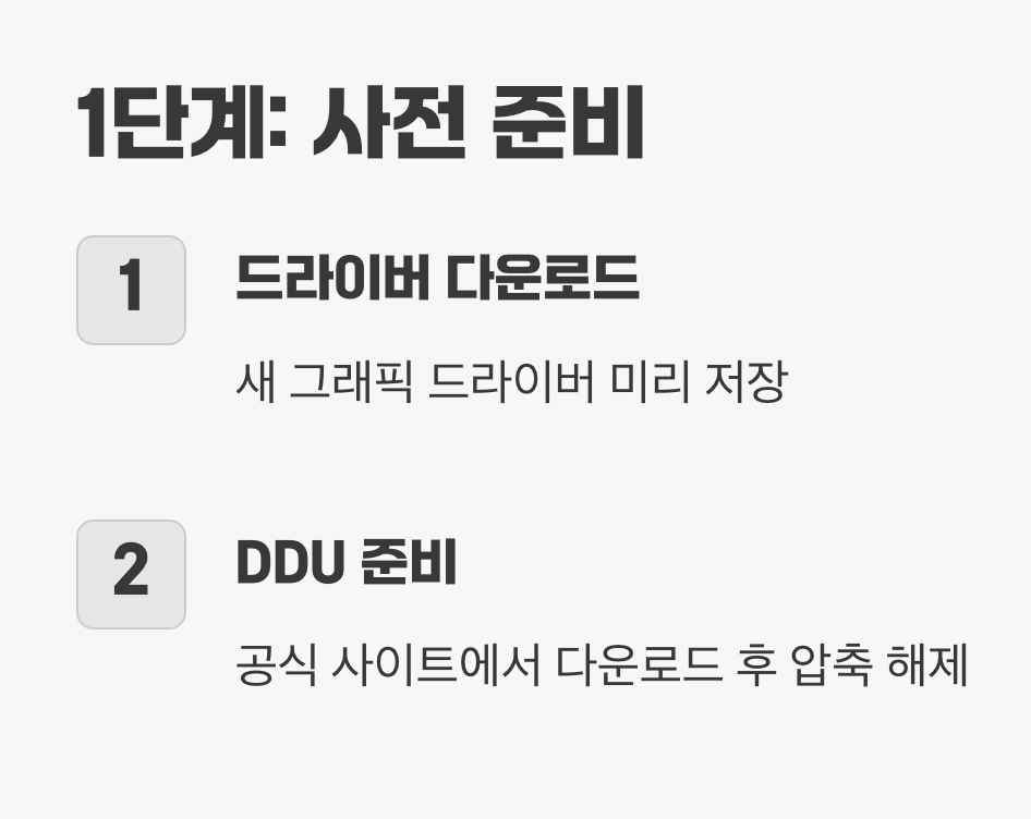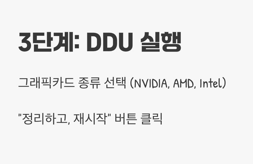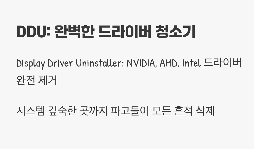 공식 홈페이지에서 DDU를 다운로드한 뒤, 안전 모드에서 실행해 GPU와 제조사를 선택하고 ‘지우고 다시 시작’을 누르면 그래픽 드라이버를 완전히 삭제할 수 있습니다. 작업 후 자동으로 재부팅됩니다. - DDU 사용법 완벽 정리! 그래픽 드라이버 완전 삭제 가이드 - 파더기