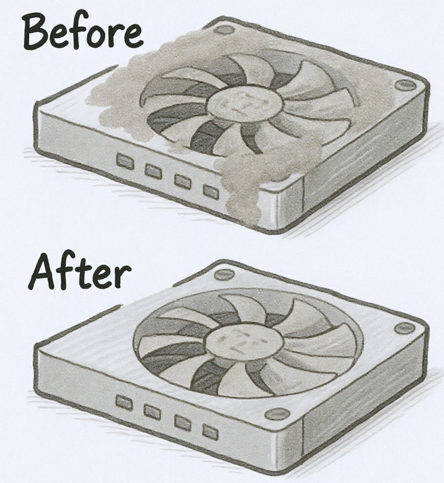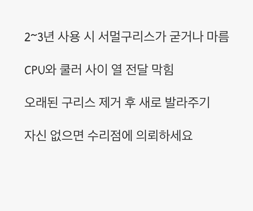 하지만 이 서멀구리스는 시간이 지나면 딱딱하게 굳거나 말라버려, 열을 제대로 전달하지 못하게 됩니다. 보통 2~3년 이상 사용한 컴퓨터에서 이런 현상이 많이 발생합니다. 해결책은 기존의 굳은 서멀구리스를 알코올 솜으로 깨끗하게 닦아내고, 새 서멀구리스를 쌀알 한 톨만큼 짜서 얇고 고르게 다시 발라주는 것입니다. 컴퓨터 조립에 익숙하지 않다면, 가까운 컴퓨터 수리점에 의뢰하는 것이 안전합니다.