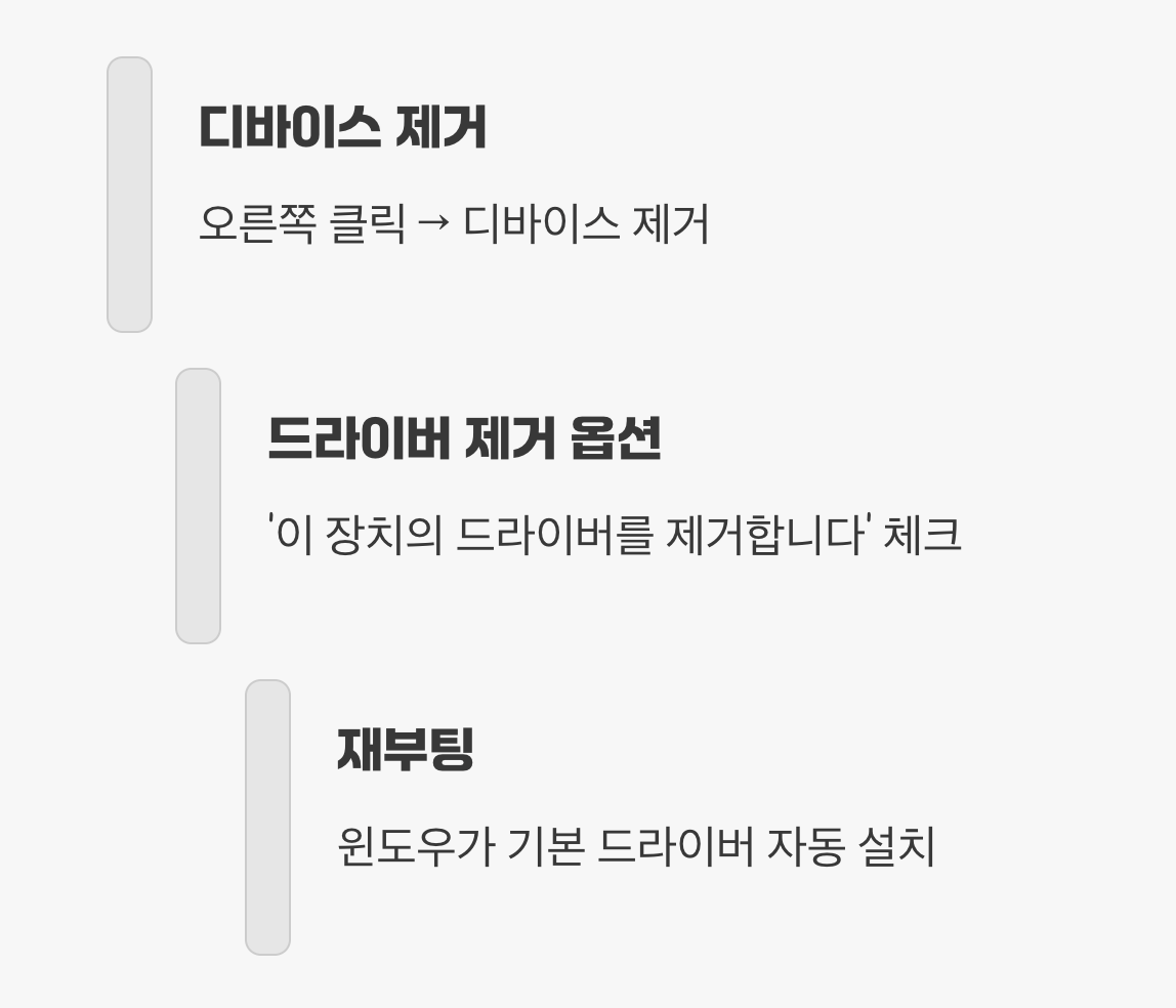 장치 관리자에서 문제가 되는 장치를 마우스 오른쪽 버튼으로 클릭한 뒤 ‘디바이스 제거’를 선택하세요. ‘이 장치의 드라이버를 제거합니다’ 옵션이 보인다면 체크하고 제거합니다. 그 후 컴퓨터를 재부팅하면, 윈도우는 통역사가 없어진 장치를 새로 발견하고, 가장 기본적인 드라이버를 자동으로 다시 설치해 줍니다. 이 과정은 꼬여있던 많은 충돌 문제를 해결해 주는 강력한 방법입니다.