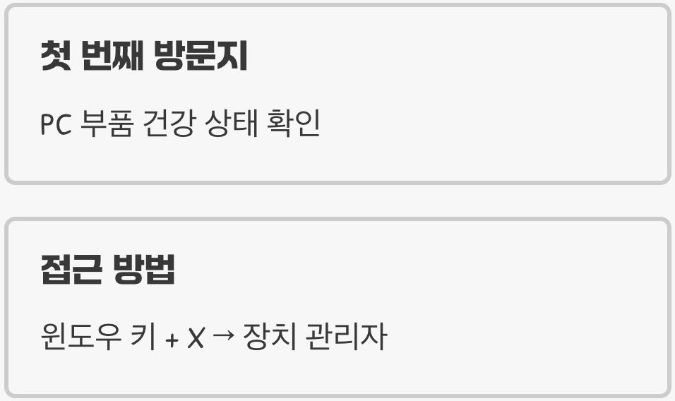 장치 관리자를 여는 가장 쉬운 방법은, 키보드의 [윈도우 키 + X]를 누른 뒤 나타나는 메뉴에서 ‘장치 관리자’를 선택하는 것입니다. 창이 열리면 사운드카드, 그래픽카드, 네트워크 어댑터 등 PC를 구성하는 모든 부품의 목록이 나타납니다. 이제부터 우리는 이 목록에서 아픈 곳을 찾아내는 탐정이 되어야 합니다.