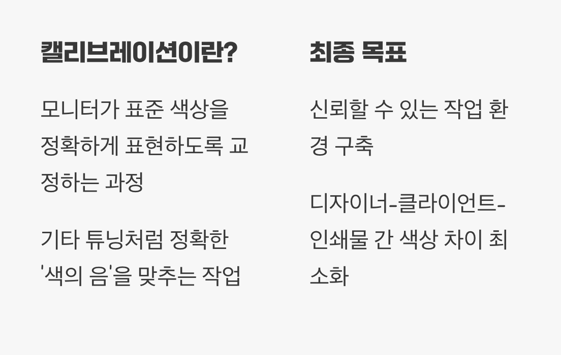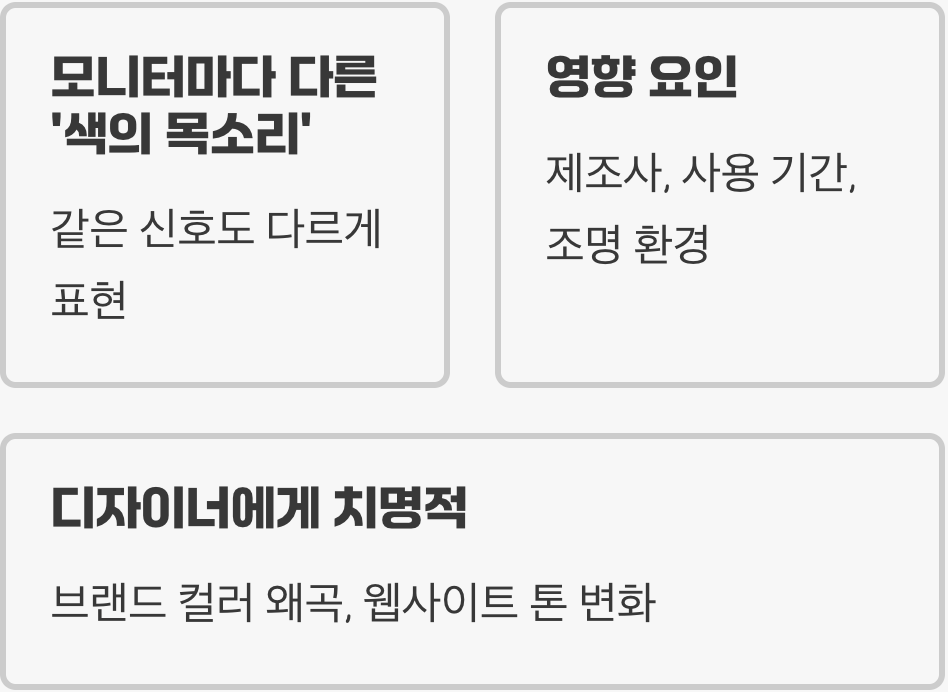 디자이너에게 이러한 '색의 오차'는 치명적일 수 있습니다. 의도했던 브랜드 컬러가 달라 보이거나, 웹사이트의 전체적인 톤이 틀어지는 원인이 되기 때문이죠. 따라서 전문적인 시각 작업을 위해서는, 이 제멋대로인 색의 목소리를 '표준'에 맞춰 조율하는 과정이 반드시 필요합니다.