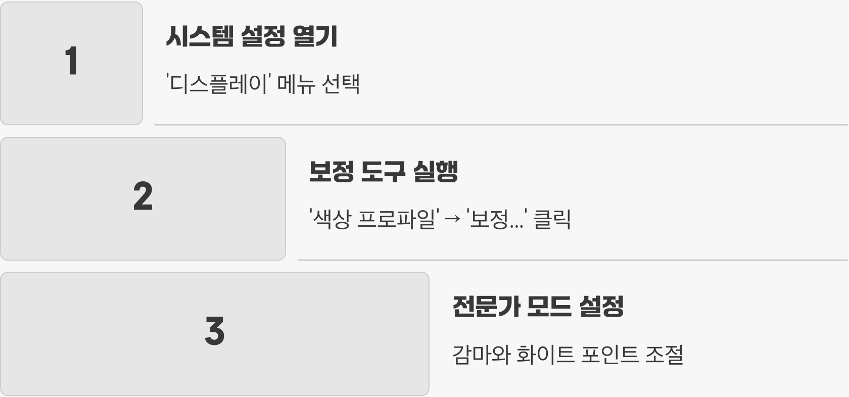 '시스템 설정'에 들어가 '디스플레이' 메뉴를 선택하세요. '색상 프로파일' 항목에서 '보정...' 버튼을 클릭하면 '디스플레이 보정기 지원'이라는 창이 나타납니다. 안내에 따라 '전문가 모드'를 체크하고, 감마와 화이트 포인트를 조절하며 사용자의 눈에 가장 자연스럽고 표준에 가까워 보이는 색상을 찾아 프로파일로 저장할 수 있습니다.