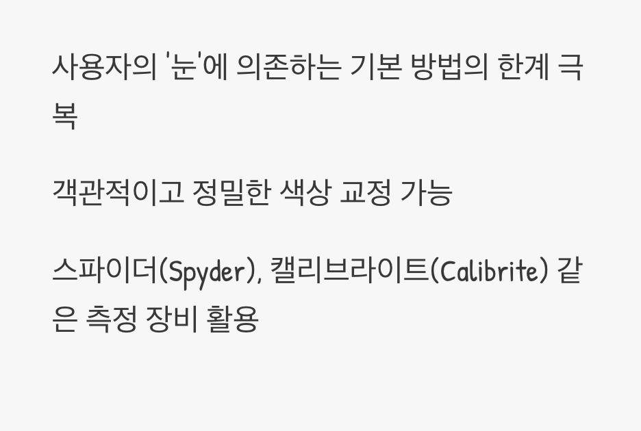 스파이더(Spyder)나 캘리브라이트(Calibrite) 같은 브랜드의 이 작은 측정 장비를 모니터 화면에 부착하면, 기기가 직접 화면의 색상을 측정하고 소프트웨어가 자동으로 오차를 보정하여 가장 정확한 색상 프로파일을 만들어줍니다. 인쇄물이나 영상 등 정밀한 색 작업이 필수적인 전문가에게는 이것이 가장 확실한 해결책입니다.