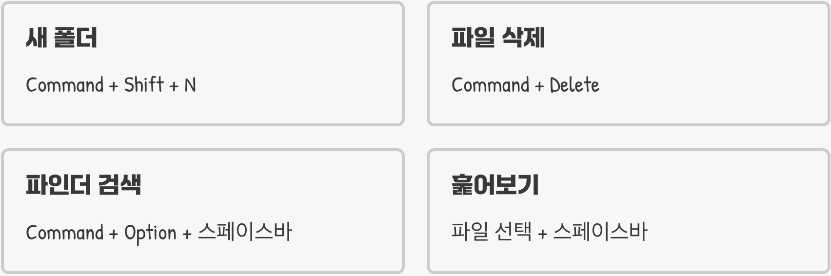 파인더에서 특정 파일을 찾고 싶을 땐, Command + Option + 스페이스 바를 눌러 별도의 파인더 검색 창을 띄울 수 있습니다. 디자이너에게 가장 강력한 기능은 바로 스페이스 바를 이용한 '훑어보기(Quick Look)'입니다. 이미지나 PDF 파일을 선택하고 스페이스 바를 누르면, 프로그램을 실행하지 않고도 파일 내용을 크고 선명하게 미리 볼 수 있어 작업 효율을 극적으로 높여줍니다.