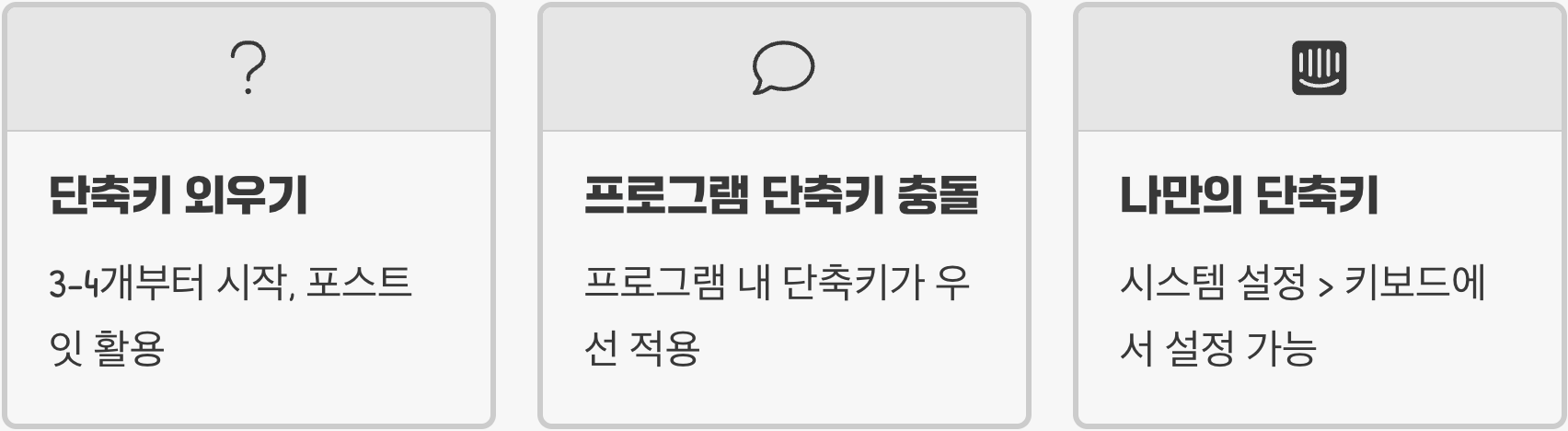 Q. 단축키가 너무 많은데, 어떻게 다 외우나요?