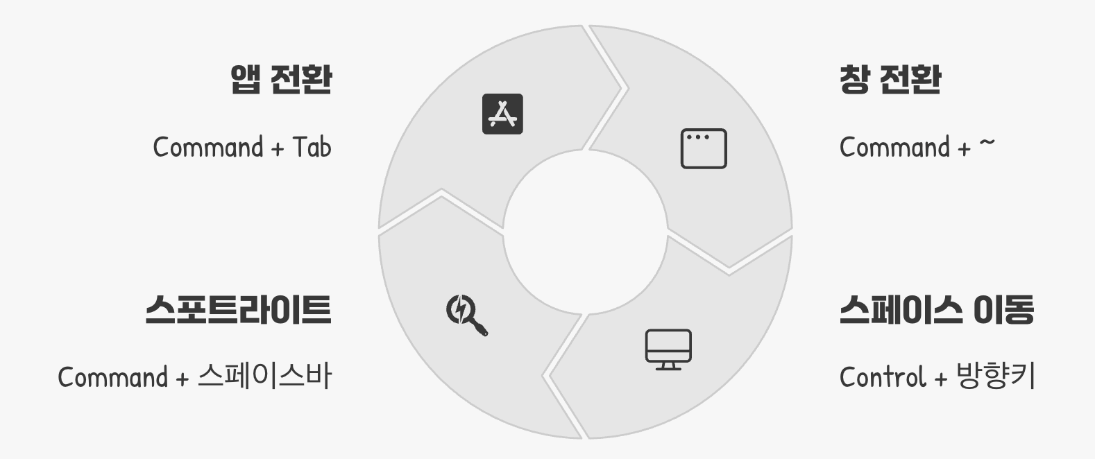 여기서 한 단계 더 나아가, 같은 프로그램 내에서 여러 개의 창을 띄워놓았을 때(예: 포토샵 파일 2개)는 Command + ~ (물결표) 키를 눌러보세요. 프로그램은 그대로 둔 채, 그 안의 창들만 전환할 수 있습니다. 여러 개의 데스크톱 화면을 사용하는 '스페이스' 기능을 활용한다면, Control + 방향키(←,→)로 화면 자체를 부드럽게 넘길 수 있습니다. 그리고 어떤 상황에서든 원하는 파일이나 프로그램을 즉시 찾고 싶을 땐, Command + 스페이스 바로 '스포트라이트(Spotlight)'를 호출하는 것이 최고의 해결책입니다.
