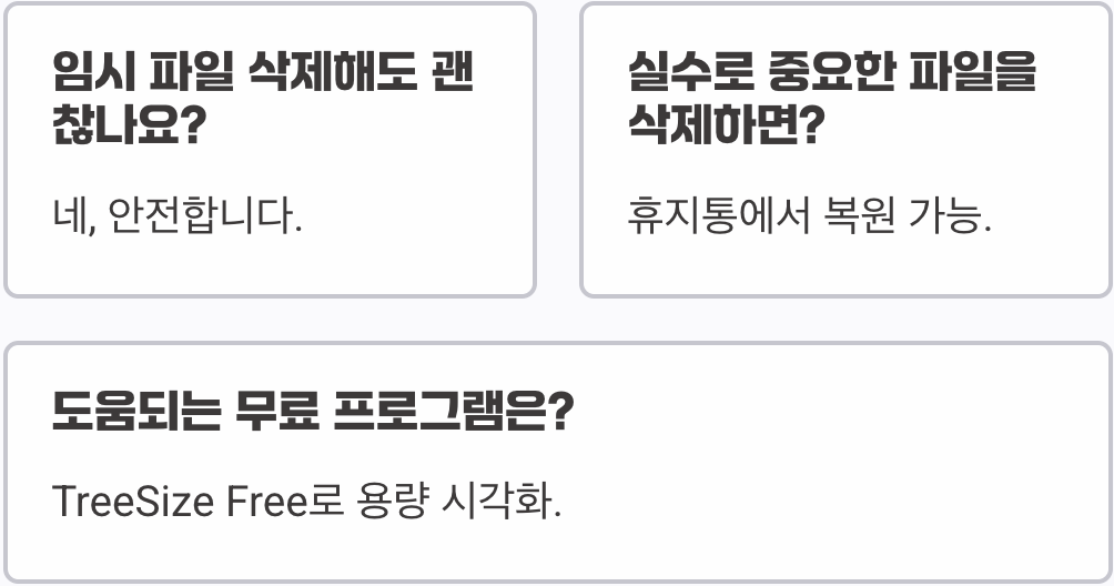 A. 네, 괜찮습니다. 윈도우의 '디스크 정리'나 '저장 공간 센스' 기능으로 삭제되는 임시 파일들은 프로그램 실행이나 웹서핑 과정에서 잠시 사용되었다가 더 이상 필요 없어진 찌꺼기 파일들입니다. 안심하고 삭제하셔도 컴퓨터 작동에 아무런 문제가 없습니다.