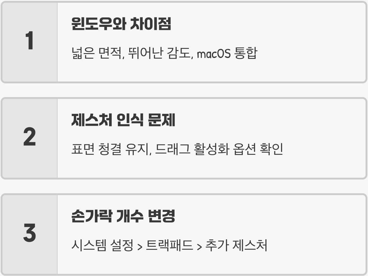 macOS에서 자주 쓰이는 트랙패드 제스처 종류별 사용법과 설정 위치, 고급 활용 팁을 한국어로 자세하게 설명합니다.