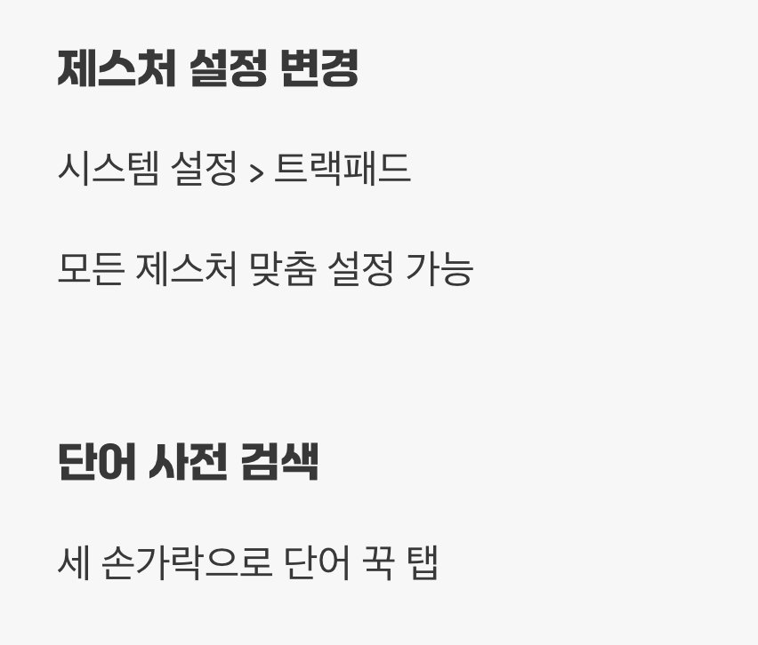 A. 네, 가능합니다. '시스템 설정 > 트랙패드 > 추가 제스처' 탭으로 이동하면, 각 제스처를 실행하는 손가락 개수를 세 손가락 또는 네 손가락으로 직접 변경할 수 있습니다.
