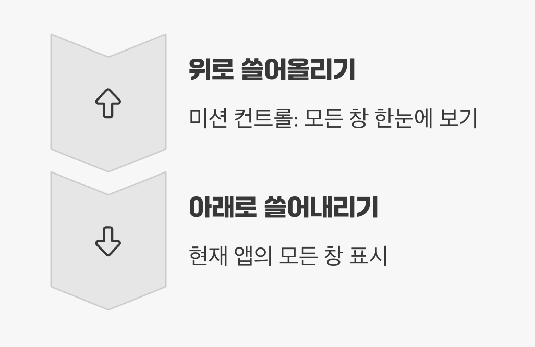 반대로, 세 손가락을 아래로 쓸어내리면 현재 활성화된 앱의 모든 창이 나타납니다. 예를 들어, 크롬 창을 여러 개 띄워놓고 작업할 때 이 제스처를 사용하면, 원하는 크롬 창으로 손쉽게 전환할 수 있습니다. Command + Tab을 연타하던 과거와는 작별하세요.