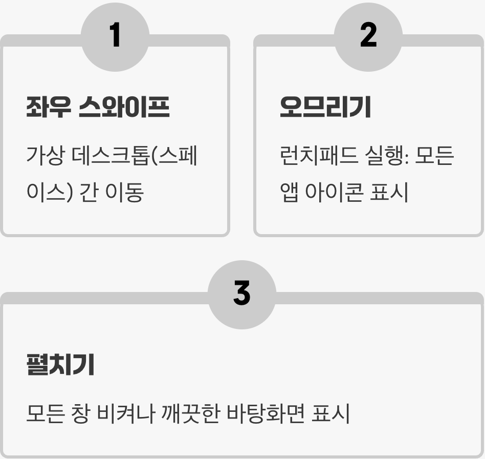 하나의 데스크톱에 너무 많은 창이 어지럽게 널려 있나요? 맥북의 '가상 데스크톱(스페이스)' 기능을 활용해 보세요. 그리고 네 손가락으로 왼쪽 또는 오른쪽으로 스와이프하면, 마치 옆방으로 이동하듯 다른 데스크톱 공간으로 순식간에 이동할 수 있습니다. '업무용 데스크톱'과 '휴식용 데스크톱'을 분리해서 사용하는 것이 가능해집니다.
