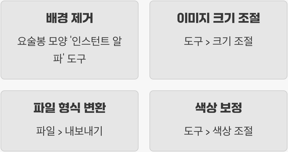 - 이미지 크기 조절: 상단 메뉴에서 '도구 > 크기 조절'을 선택하면, 픽셀 단위로 정확하게 이미지의 가로, 세로 크기를 변경할 수 있습니다.