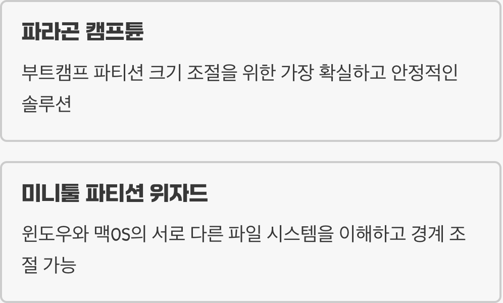 특히 '파라곤 캠프튠'은 오직 부트캠프 파티션의 크기를 조절하는 단 하나의 목적을 위해 태어난, 가장 확실하고 안정적인 솔루션입니다. 복잡한 과정 없이, 마치 창문의 크기를 조절하듯 슬라이더 하나만으로 두 운영체제의 공간을 자유자재로 재분배할 수 있게 해줍니다.