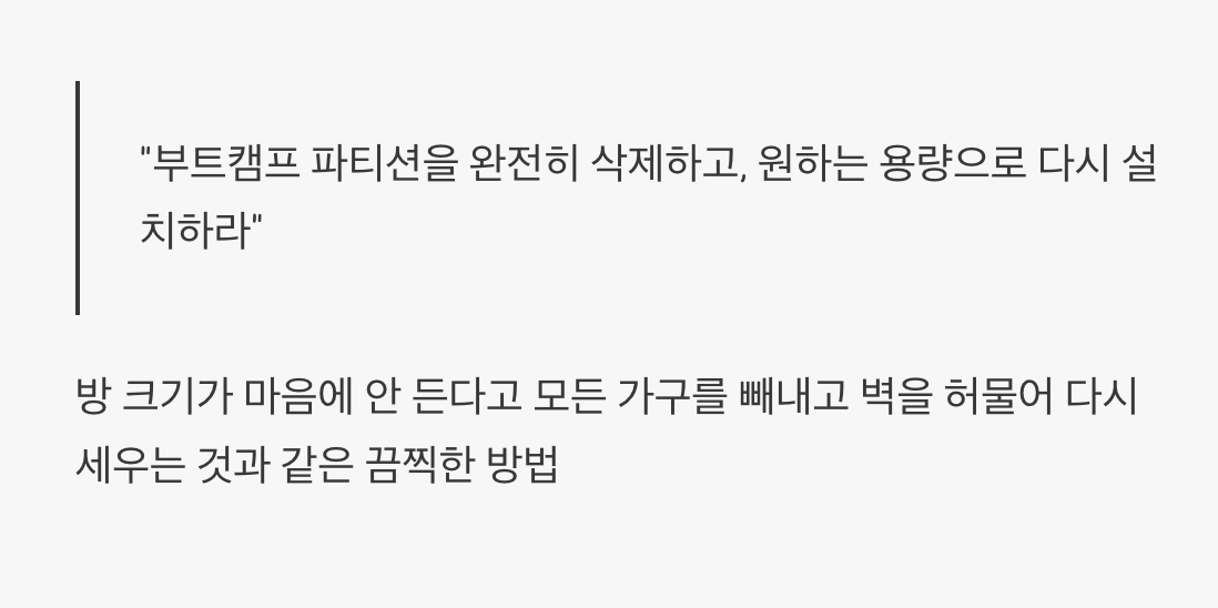 "그럼 애플은 어떻게 하라고 하나요?" 라고 물으신다면, 공식적인 답변은 아주 절망적입니다. 바로, "부트캠프 파티션을 완전히 삭제하고, 원하는 용량으로 다시 설치하라"는 것입니다. 이는 마치 방 크기가 마음에 안 든다고, 방 안의 모든 가구를 밖으로 빼낸 뒤 벽을 허물고, 다시 벽을 세운 다음 가구를 들여놓으라는 것과 같습니다.