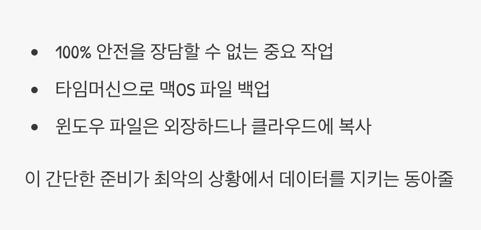 맥OS의 중요한 파일은 '타임머신(Time Machine)'을 이용해 외장하드에 반드시 백업해두고, 윈도우 파티션의 중요한 자료 역시 별도의 외장하드나 클라우드에 복사해두는 습관이 필요합니다. 이 간단한 준비 과정이, 혹시 모를 최악의 상황에서 당신의 소중한 데이터를 지켜줄 유일한 동아줄이 될 것입니다.