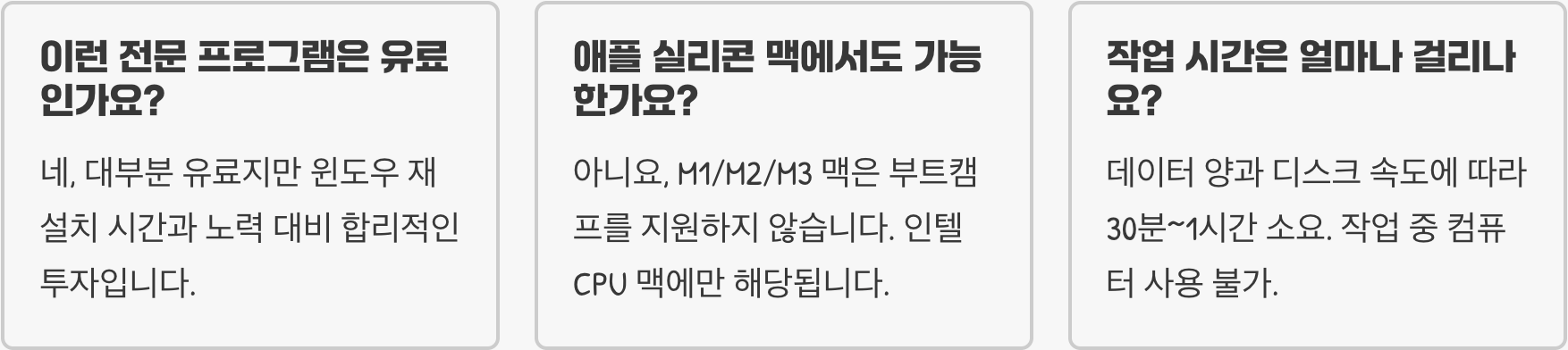 A. 데이터의 양과 디스크의 속도에 따라 다르지만, 보통 30분에서 1시간 내외의 시간이 소요됩니다. 작업 중에는 컴퓨터를 사용할 수 없으니, 여유로운 시간을 확보하고 진행하는 것이 좋습니다.
