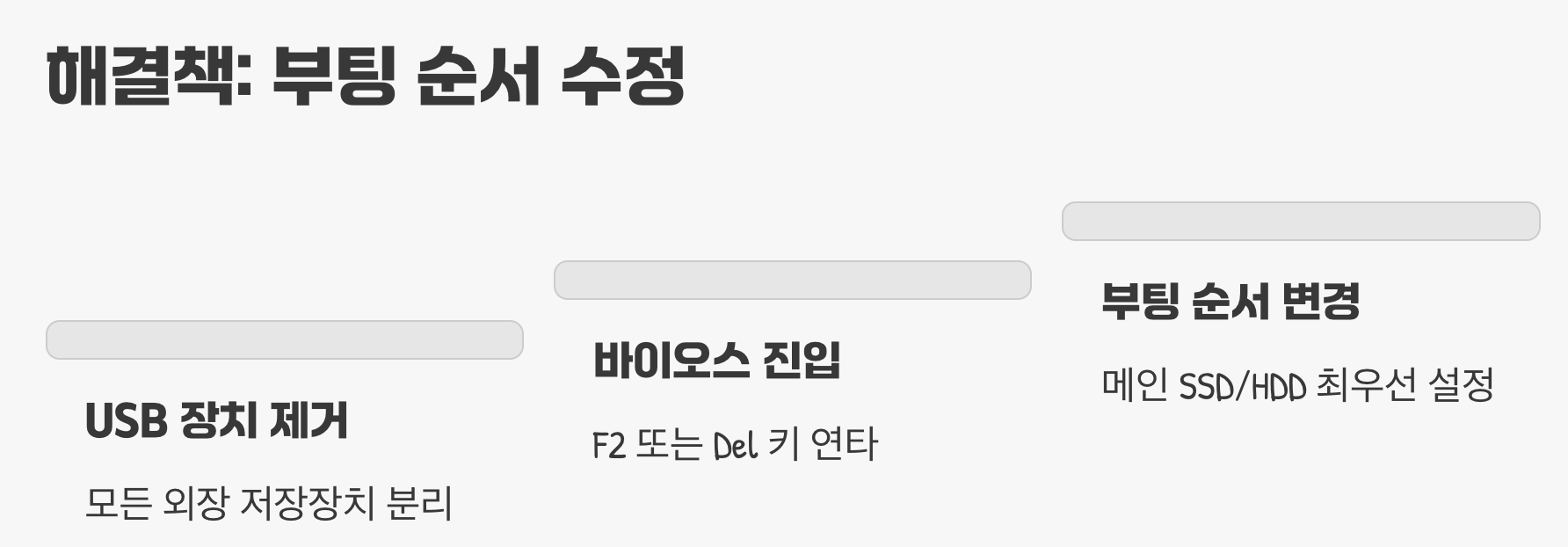 특히 USB 메모리나 외장 하드를 컴퓨터에 꽂아 둔 채로 재부팅했을 때 이런 문제가 자주 발생합니다. 컴퓨터가 메인 저장장치 대신, 윈도우가 없는 USB에서 부팅을 시도하다가 실패하는 것이죠. 가장 먼저 할 일은, 컴퓨터에 연결된 모든 USB 장치와 외장 하드를 뽑고 다시 부팅해 보는 것입니다. 이 간단한 조치만으로도 문제가 허무하게 해결되는 경우가 정말 많습니다.