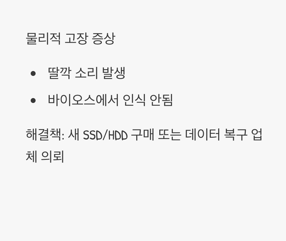 위의 모든 방법을 시도했음에도 불구하고 컴퓨터가 여전히 저장장치를 인식하지 못한다면, 안타깝게도 저장장치(SSD/HDD) 자체의 물리적인 고장을 의심해 봐야 합니다. 특히 하드디스크(HDD)에서 ‘딸깍, 딸깍’하는 주기적인 소음이 들린다면, 이는 하드웨어 수명이 다했다는 매우 심각한 신호입니다.