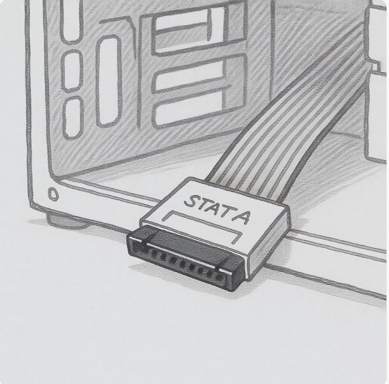 소프트웨어적인 문제가 아니라면, 다음으로 의심해야 할 것은 바로 하드웨어의 ‘물리적인 연결’ 상태입니다. 컴퓨터의 메인보드와 저장장치(SSD/HDD)는 ‘SATA 케이블’이라는 선으로 연결되어 데이터를 주고받습니다. 그런데 이 케이블이 미세하게 헐거워지거나 빠져버리면, 컴퓨터는 저장장치 자체를 인식하지 못하게 됩니다.