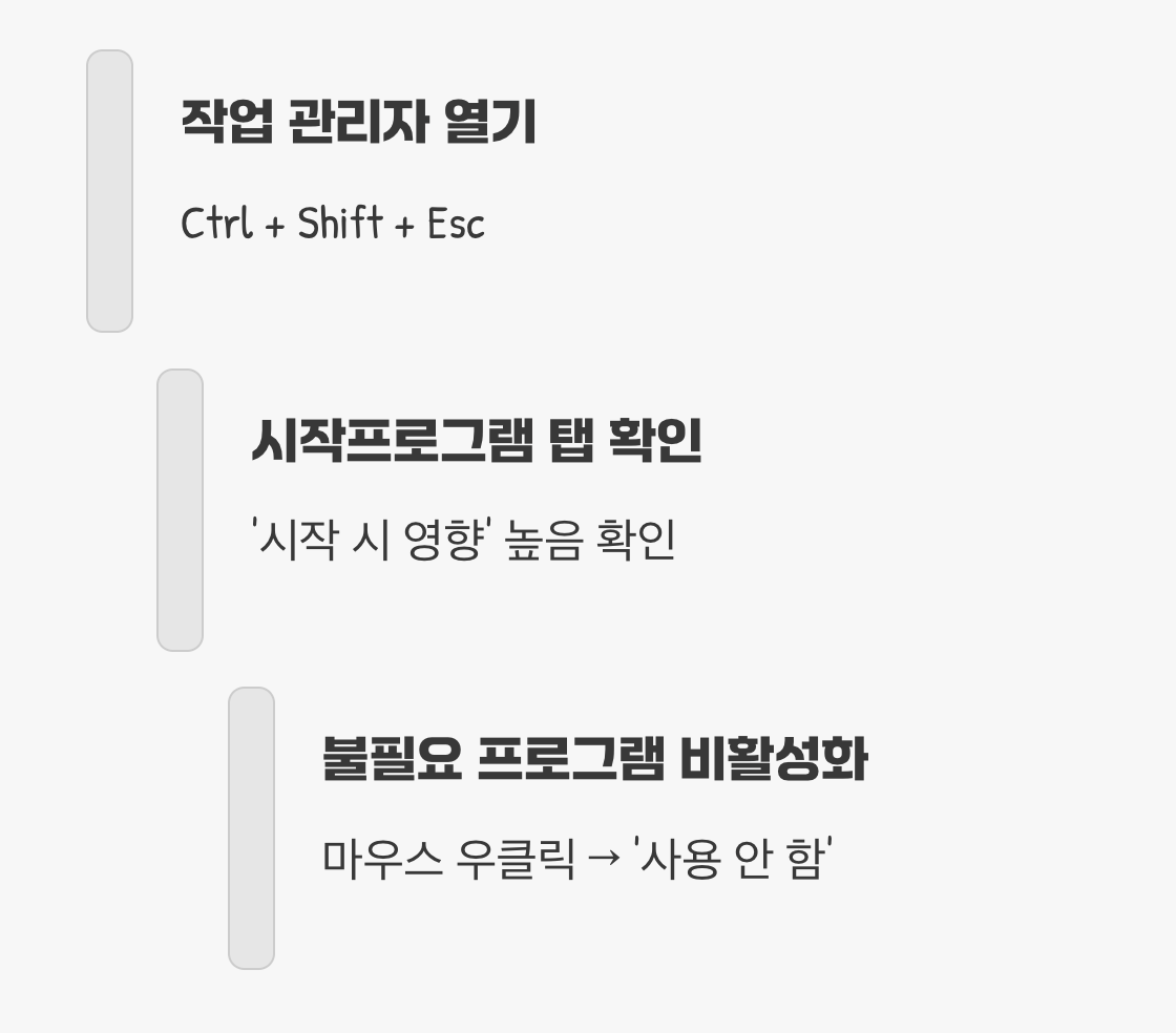 메신저, 보안 프로그램, 클라우드 서비스, 그래픽 드라이버 관리 프로그램 등 수많은 프로그램들이 윈도우와 함께 시작되려고 줄을 서는 것이죠. 이렇게 함께 일어나려는 식구들이 많아지면, 당연히 컴퓨터가 잠에서 깨어나는 시간은 길어질 수밖에 없습니다. 이 불필요한 아침 손님들을 정리하는 것이, 부팅 속도 향상의 첫걸음입니다.