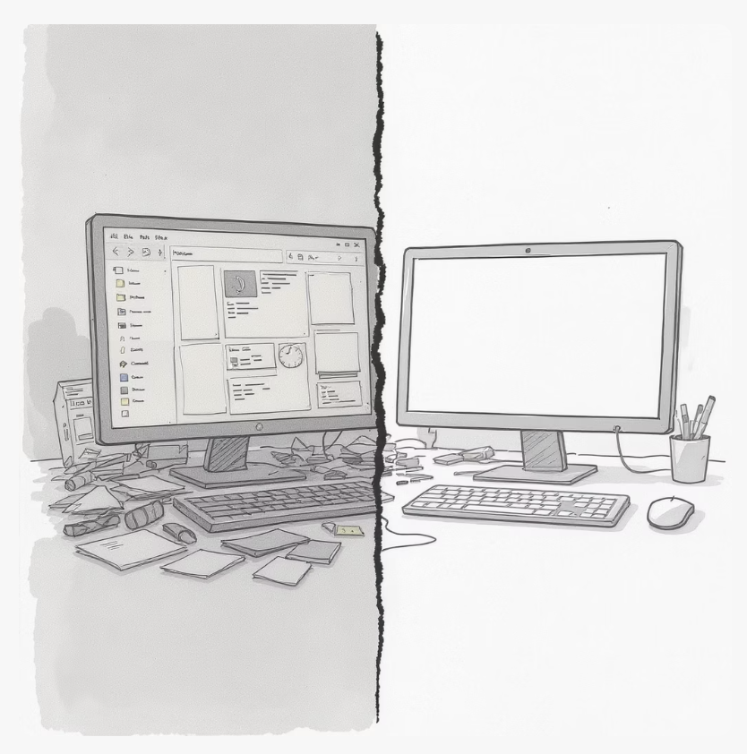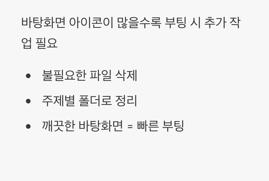 의외로 많은 분이 놓치는 부분이 바로 ‘바탕화면’ 정리입니다. 바탕화면에 수많은 파일과 바로 가기 아이콘이 널려있으면, 윈도우는 부팅 과정에서 이 아이콘들을 화면에 표시하기 위해 추가적인 작업을 수행해야 합니다. 아이콘 하나하나가 컴퓨터에게는 작은 짐이 되는 셈이죠.