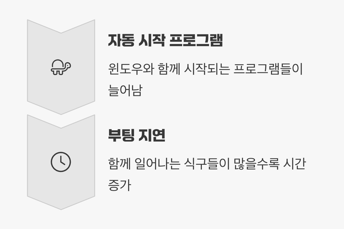 컴퓨터가 켜지는 과정, 즉 ‘부팅’은 운영체제(윈도우)가 잠에서 깨어나 일을 시작하기 위해 준비 운동을 하는 과정과 같습니다. 그런데 우리가 여러 프로그램을 설치하고 사용하면서, "나도 윈도우 시작할 때 같이 깨워줘!"라고 등록되는 프로그램들이 점점 늘어나게 됩니다.