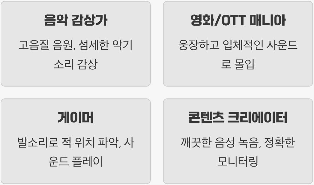- 영화/OTT 매니아: 영화관처럼 웅장하고 입체적인 사운드로 콘텐츠에 깊이 몰입하고 싶은 분.