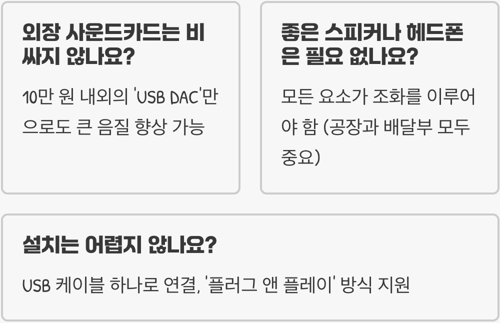 A. 전문가용 하이엔드 제품은 수백만 원을 호가하기도 하지만, 최근에는 10만 원 내외의 'USB DAC' 제품만으로도 내장 사운드와는 비교할 수 없는 수준의 음질 향상을 경험할 수 있습니다.