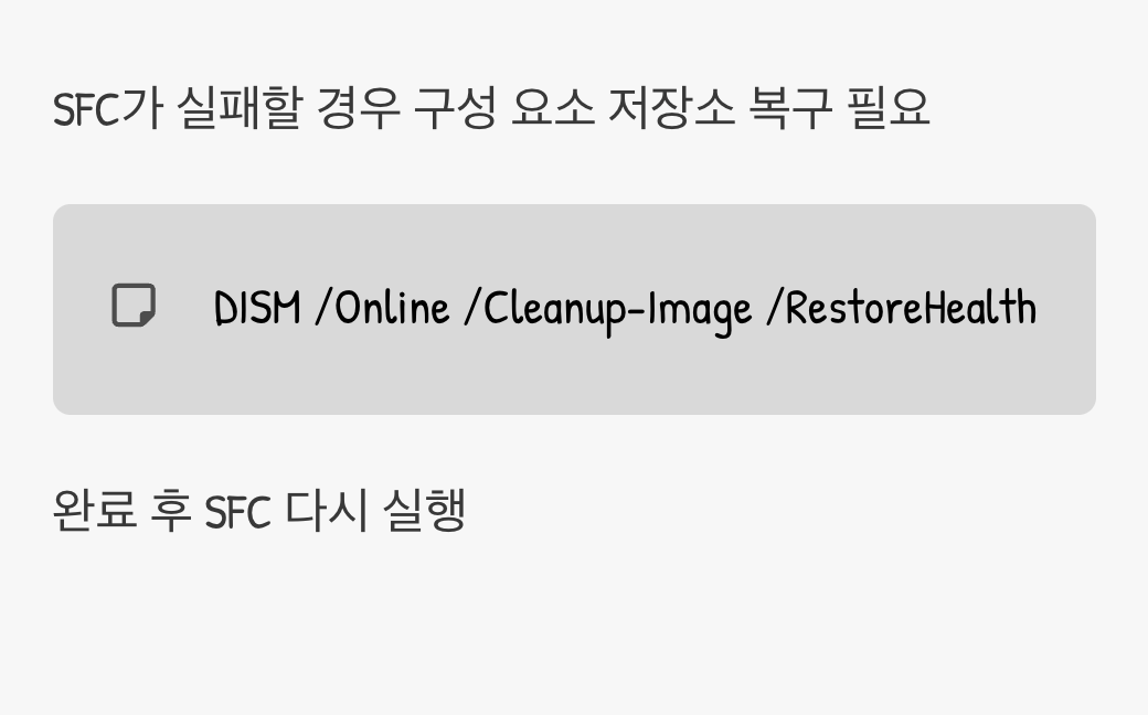 만약 SFC 도구가 일부 파일을 복구하지 못했다면, 이는 SFC가 파일을 교체할 때 참고하는 원본 설계도(구성 요소 저장소) 자체에 문제가 생겼기 때문일 수 있습니다. 이럴 때는 SFC의 상급 의사라고 할 수 있는 ‘DISM’ 명령어를 먼저 실행해 이 원본 설계도를 복구해야 합니다.