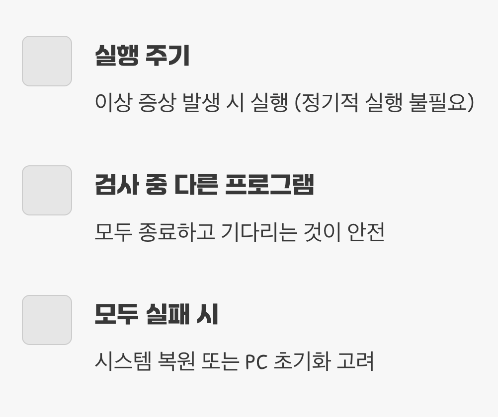 A. 특별히 정해진 주기는 없습니다. 컴퓨터가 느려지거나 오류가 발생하는 등 이상 증상이 느껴질 때 점검 차원에서 실행해 주면 좋습니다. 평소에 문제가 없다면 굳이 실행할 필요는 없습니다.