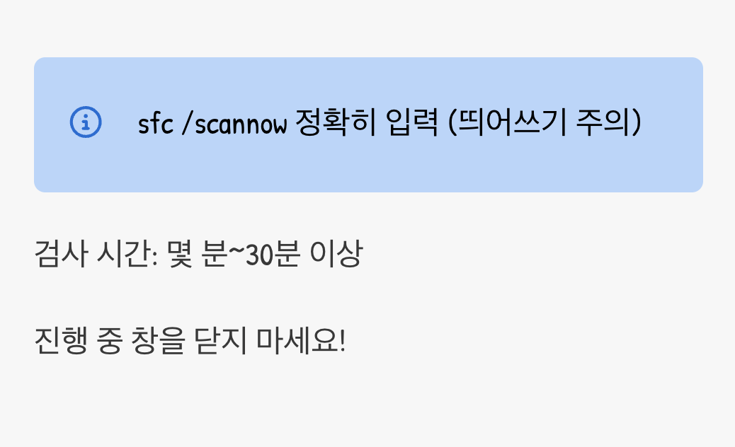 A. 시스템 파일을 직접 검사하고 수정하는 중요한 작업이므로, 가급적 다른 프로그램은 모두 종료하고 검사가 완료될 때까지 기다리는 것이 가장 안전하고 좋습니다.