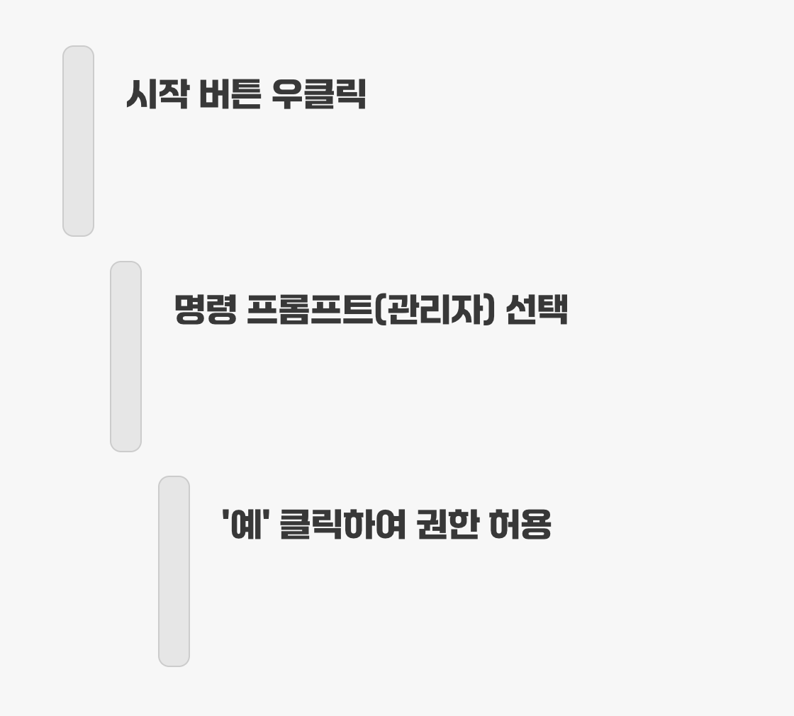 먼저, 화면 왼쪽 아래의 시작 버튼에 마우스 커서를 올리고 오른쪽 버튼을 클릭하세요. 여러 메뉴가 나타나면 그중에서 ‘명령 프롬프트(관리자)’ 또는 ‘Windows PowerShell(관리자)’ 항목을 찾아 클릭합니다. ‘이 앱이 디바이스를 변경하도록 허용하시겠어요?’ 라는 창이 뜨면 ‘예’를 누르세요. 검은색 또는 파란색의 명령창이 나타났다면 모든 준비가 끝난 것입니다.