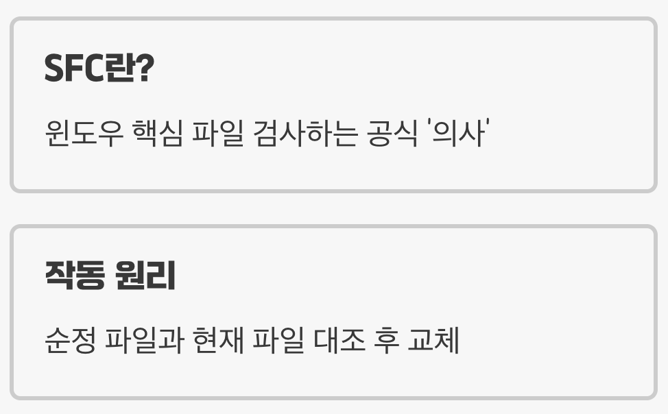 SFC는 윈도우 운영체제의 안정성을 유지하고 오류를 예방하는 데 유용한 도구로, 검사 후 손상된 파일이 있으면 자동 복구를 시도합니다. 검사 결과 메시지에 따라 추가 조치가 필요할 수 있습니다.