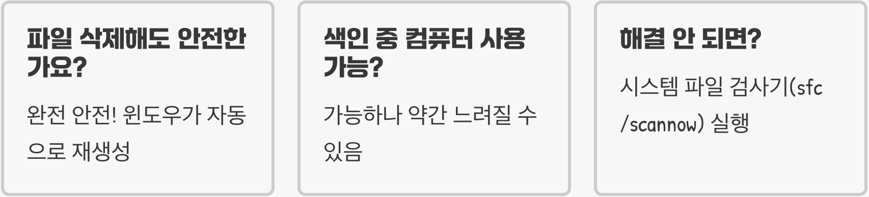 낡은 색인 카드를 모두 비웠으니, 이제 윈도우가 새로운 색인 카드를 처음부터 다시 만들도록 명령해야 합니다.