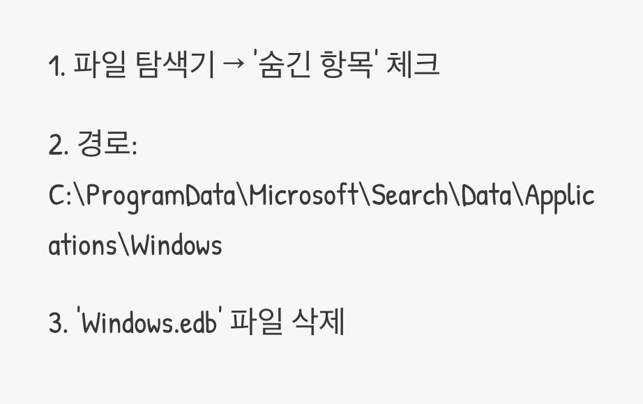 이제 낡고 엉망이 된 색인 카드들을 모두 버릴 차례입니다. 파일 탐색기를 열고, 상단 메뉴의 '보기' 탭에서 '숨긴 항목'에 체크하여 숨겨진 폴더가 보이도록 설정해주세요. 그다음, 아래의 경로로 직접 이동합니다.