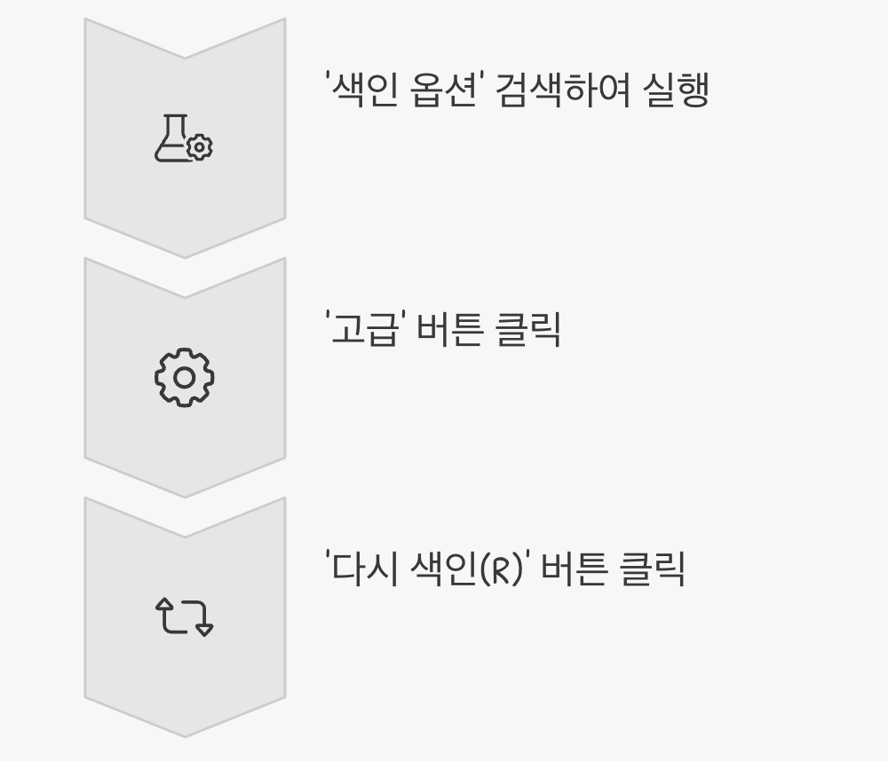 이제 윈도우는 당신의 컴퓨터에 있는 모든 파일을 처음부터 다시 스캔하며, 깨끗하고 새로운 '색인 카드'를 만들기 시작합니다. 이 과정은 컴퓨터의 파일 수에 따라 몇십 분에서 몇 시간까지 걸릴 수 있으니, 컴퓨터를 켜 둔 채로 잠시 다른 일을 하며 기다리는 것이 좋습니다.