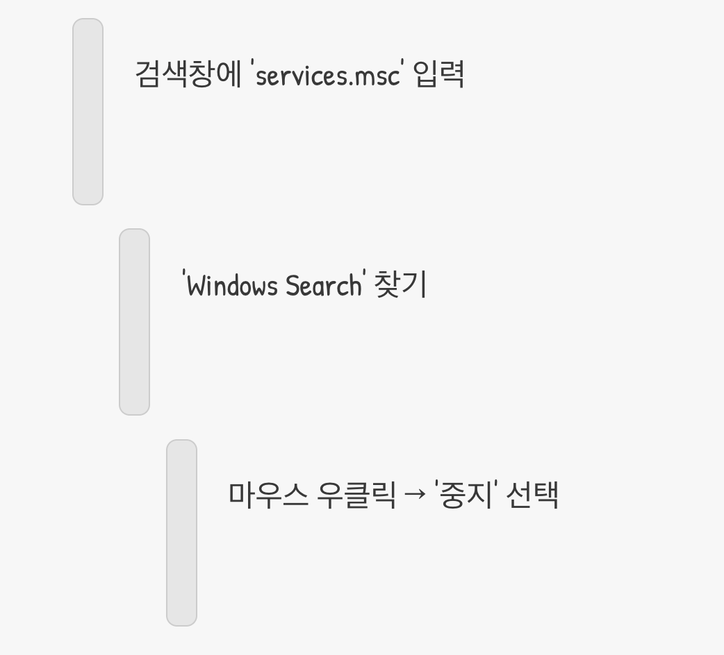 엉망이 된 도서관을 정리하려면, 가장 먼저 도서관의 문을 잠시 닫아야겠죠. 우리 컴퓨터에서도 마찬가지입니다. 꼬여버린 인덱스를 초기화하기 전에, 이 인덱싱 기능을 담당하는 'Windows Search' 서비스를 잠시 멈춰야 합니다.