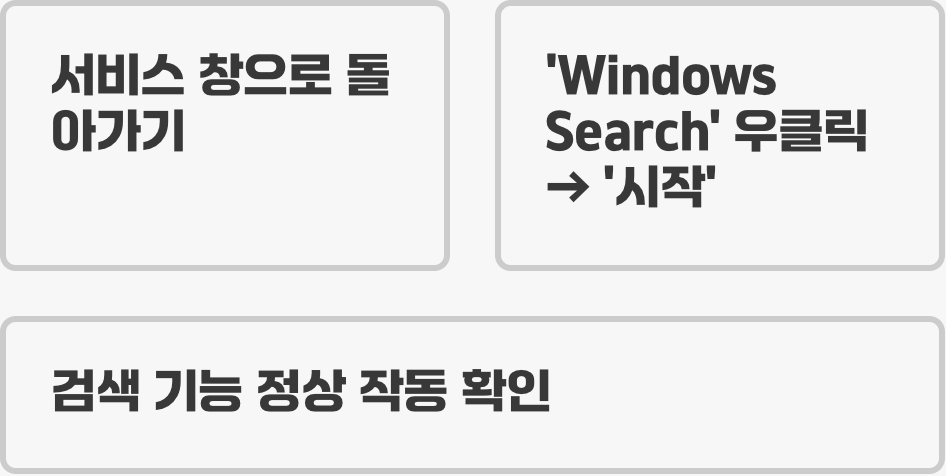 새로운 색인 카드 만들기가 완료되면(색인 옵션 창 상단에 '색인이 완료되었습니다' 라고 표시됩니다), 이제 다시 도서관의 문을 열어야 합니다. 아까 열어두었던 '서비스' 창으로 돌아가, 중지시켰던 'Windows Search' 항목을 마우스 오른쪽 버튼으로 클릭하여 '시작'을 선택하세요.