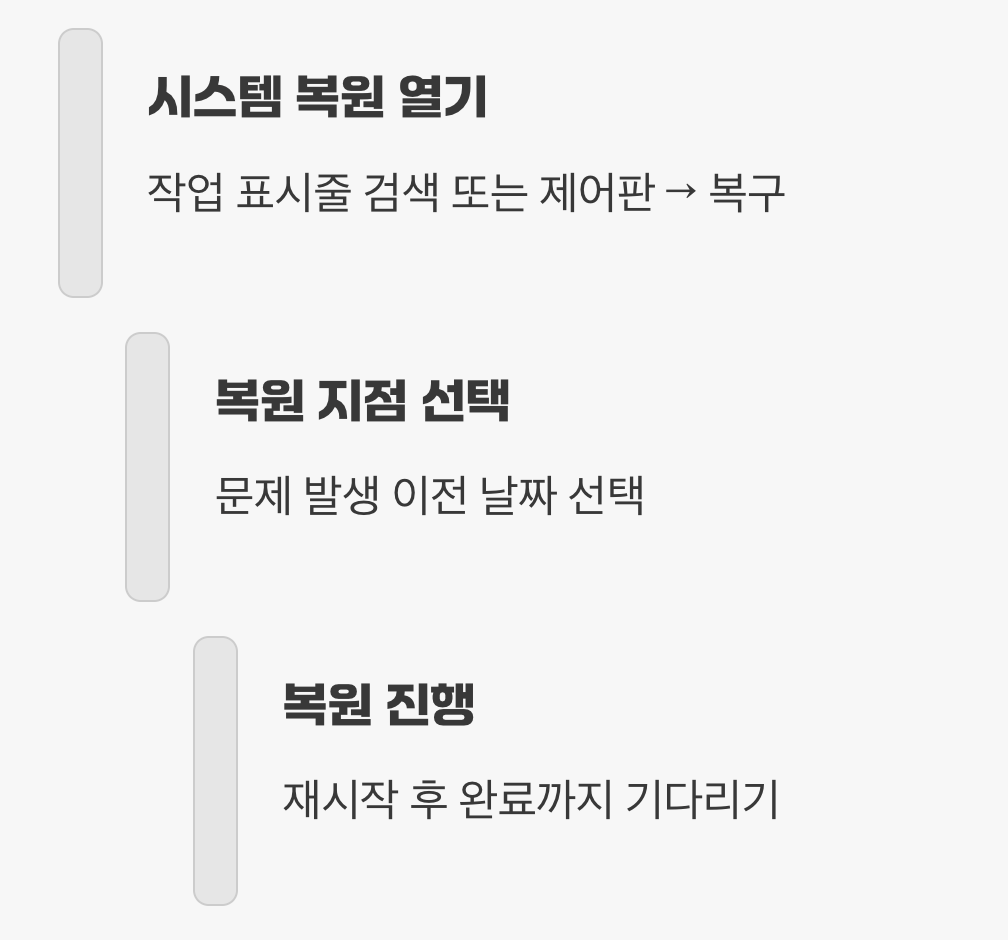 이제 실제로 문제가 발생했을 때 시간을 되돌리는 방법을 알아보겠습니다. 이 과정 역시 어렵지 않으니 천천히 따라 해보세요. 작업 표시줄 검색창에 '시스템 복원'을 검색하거나, '제어판'에 들어가 '복구' 메뉴를 선택하면 시스템 복원 창을 열 수 있습니다.